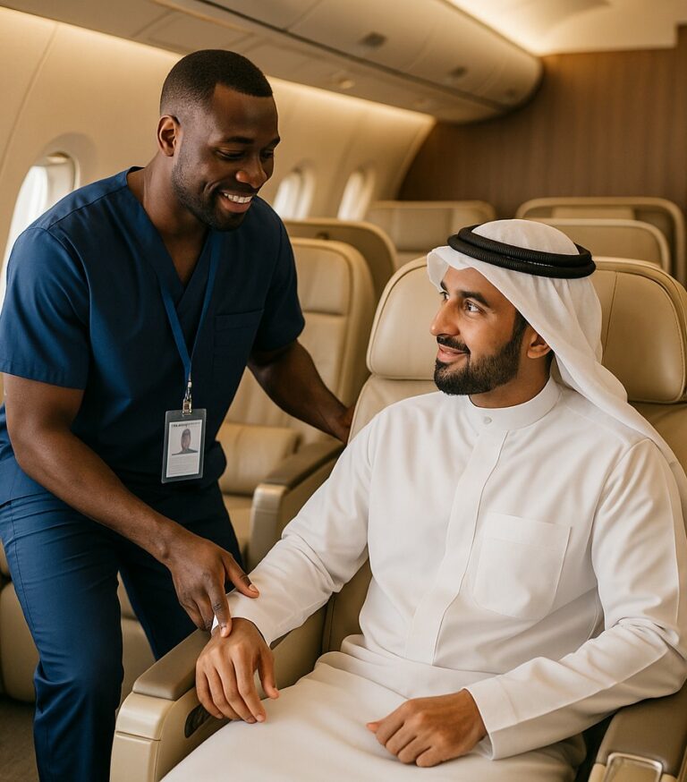 Nurse Escorts – Registered nurses accompanying patients requiring medical observation, medication management, or post-surgical monitoring during flights.
